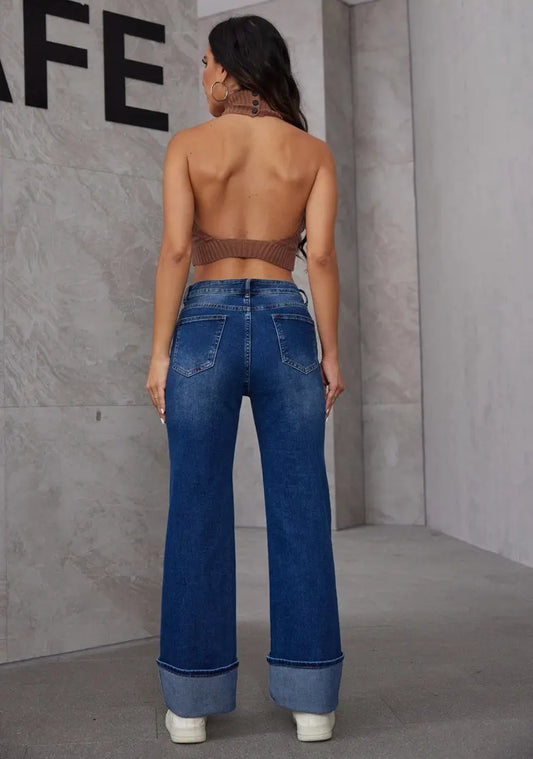 Jean incurvé à taille haute et jambes larges avec ourlet retroussé en bleu